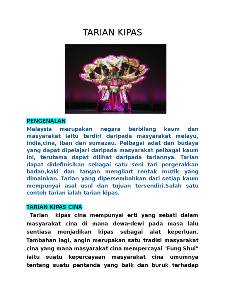 Web Contextual translation of tarian kipas into English. Web Contextual translation of tarian kipas in malaysia into English. Tarian kipas merupakan satu jenis tarian yang memerlukan 9 orang ahli di mana 7 wanita dan 2 lelaki.